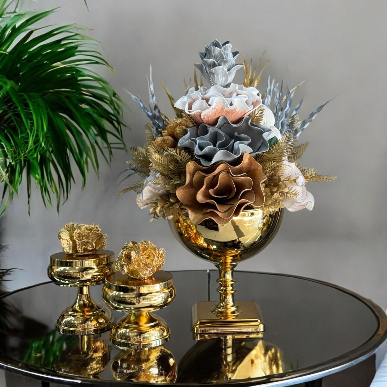 Dekoratif Lale Saksı Çiçek Aranjmanı & 2'li Mercan Ayaklı Kutu 3 Parça Set Gold